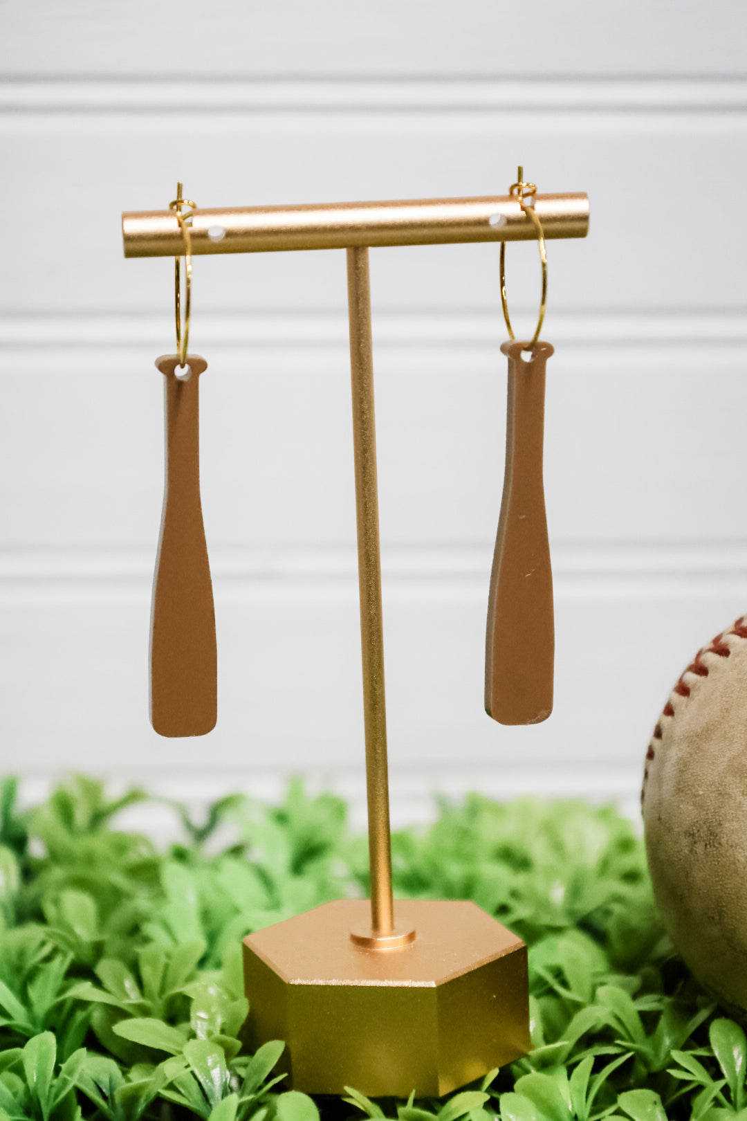 Designed for versatility and style, this set features a sleek gold hoop paired with a lightweight acrylic baseball and bat. Wear them your way: